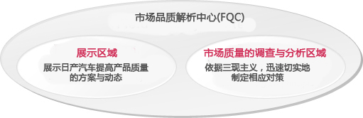 市場品質解析中心(FQC)的具體活動為調查分析市場質量(FQIA)※1,目的在于"以顧客驚訝的速度實現快捷改善"。因此,日產汽車構建起讓供應商和日產汽車相關部門※2聯合起來,對改善要素進行深入研究的體制。通過讓與零部件相關的人員面對實物展開討論的方式,力爭在最短時間內找到最佳解決方案。