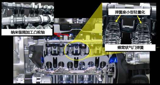 · 納要同時實現杰出的加速性能和較高的燃油經濟性,需要徹底降低摩擦力(摩擦阻力)。納米級精加工凸輪軸是在凸輪軸表面進行納米級精加工,并打磨至相當于鏡面的光滑度降低摩擦力。蜂窩狀氣門彈簧是將彈簧上部制成纏繞狀,實現了彈簧座的小型輕量化。