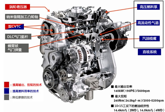 匯集了基于DIG的燃燒室冷卻及柔性燃燒控制、基于渦輪增壓器的高增壓、基于雙CVTC的進、排氣控制以及徹底的低摩擦化等各種各樣的技術。