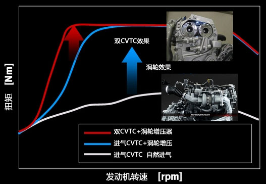 MR16DDT發動機通過渦輪增壓器提高混合氣體的充填效率,進而提高了輸出功率和扭矩。而且,順應發動機轉速以及節氣門開度等狀況,通過采用兩個連續改變氣門開閉時間的CVTC(進、排氣可變氣門正時控制系統),最大限度地發揮了填充效率。從而,提高了曾是傳統渦輪增壓器薄弱環節的低中速區域的響應速度。
