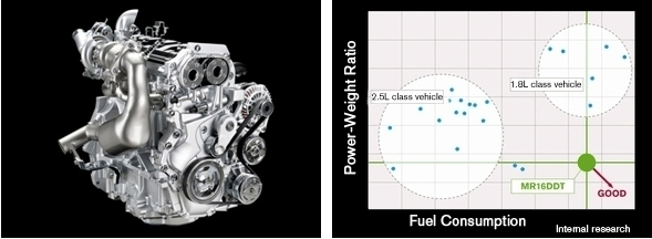 發揮了相當于2.5L發動機的動力性能,同時實現了優越的燃油經濟性的MR16DDT發動機是帶有渦輪增壓器的DIG (Direct Injection Gasoline :缸內直接燃料噴射式)發動機,除排氣側之外,也在進氣側采用了CVTC(可變氣門正時控制系統),通過與渦輪的組合,實現了大功率和高扭矩,并為了提高燃油經濟性,也采用了各種降低摩擦的技術。