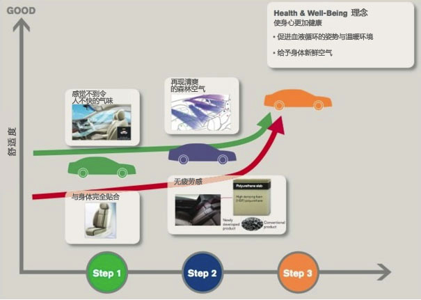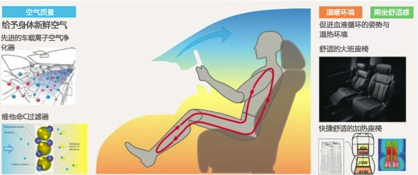 日產(chǎn)將"減輕身體負(fù)擔(dān)和疲勞"的"舒適性"理念發(fā)展為旨在"使身心更加健康"的 "Health & Wellbeing(健康與幸福)理念"。利用促進血液循環(huán)的舒適姿勢和溫暖環(huán)境,以及為身體提供新鮮空氣,來實現(xiàn) "Health & Wellbeing"(健康與幸福)這一理念。