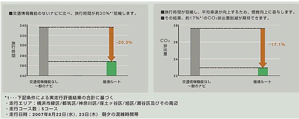 這是實(shí)際的行駛結(jié)果。綠色路線是參考了交通信息的的路線,煙灰色路線是沒有參考交通信息的路線。從神奈川縣橫濱市出發(fā)至東京都町田市的例子中,參考了交通信息選擇最快路徑的人可早到約40分鐘。