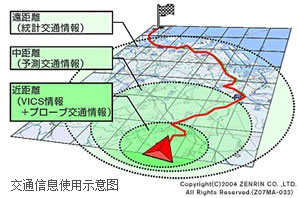 最快路徑探測是指將從本車位置到目的地之間的距離分為3段,根據(jù)正確的交通信息在每個(gè)區(qū)域探索路徑。 在每個(gè)區(qū)域中利用的交通信息如下所示。 在本車位置附近的近距離區(qū)域中使用作為實(shí)時(shí)交通信息的VICS信息,在VICS信號未覆蓋的公路上使用探測實(shí)時(shí)交通信息;在中等距離區(qū)域中以VICS信息為主, 使用實(shí)時(shí)預(yù)測通過時(shí)刻的交通狀況的預(yù)測交通信息;在遠(yuǎn)距離區(qū)域中使用對日常交通狀況進(jìn)行統(tǒng)計(jì)處理之后的統(tǒng)計(jì)交通信息,然后結(jié)合這些交通信息探測路徑。