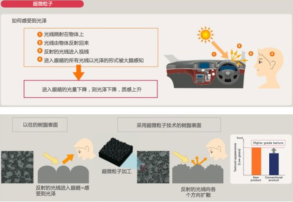 日產(chǎn)對人在看到物體時所能感受到的質(zhì)感加以分析,通過精細(xì)的表面加工技術(shù)(確保樹脂表面上乘質(zhì)感的同時保證其功能性),實現(xiàn)了超越以往樹脂零部件的上乘質(zhì)感。
