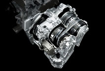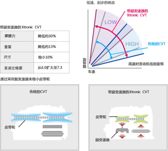 相對傳統(tǒng)的系統(tǒng),降低了摩擦力和重量,尺寸也實現(xiàn)了小型化。同時大大地拓寬了變速比幅度。另外,通過新采用副變速器,成功實現(xiàn)了CVT皮帶輪的小型化。從而,大幅度實現(xiàn)了輕量化。而且,通過增大變速比,提高了變速響應(yīng)速度和燃油經(jīng)濟性。