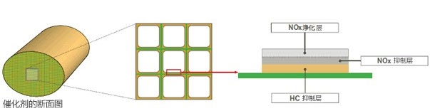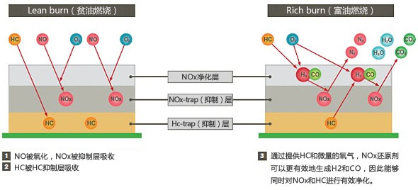 以往的NOx-trap催化劑在富油燃燒時只能凈化NOx,為了能夠在凈化NOx中更加高效地利用抑制物質HC,此新品催化劑增加了HC-trap(抑制)層。因此實現了在富油燃燒時,同時對HC和NOx進行高效凈化。