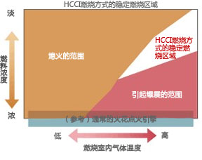 是像Homogeneous-Charge Compression Ignition combustion(均質(zhì)混合氣壓燃燒技術(shù))汽油引擎那樣吸進(jìn)混合氣體,并像柴油引擎那樣通過高壓縮自行點(diǎn)火的引擎。是即使在燃料濃度極其稀薄的區(qū)域也能燃燒的理想內(nèi)燃機(jī)之一。為了實(shí)現(xiàn)該性能,必須時(shí)刻將燃燒室內(nèi)的氣體溫度和燃料濃度控制在最佳狀態(tài)。