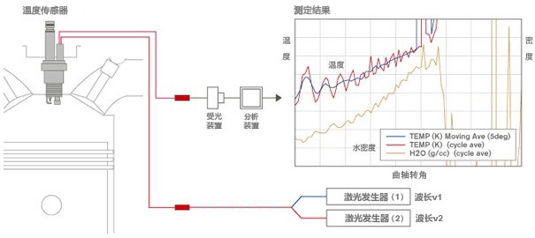 將特殊的兩束紅外線激光照射入燃燒室內(nèi),利用受光裝置測(cè)定所返回紅外線的強(qiáng)度。由燃燒室內(nèi)所吸收的紅外線量來計(jì)算出溫度。與斯坦福大學(xué)共通開發(fā)出了以水分子為對(duì)象的溫度測(cè)定方法,與PSI公司合作,共同開發(fā)與制作了該測(cè)定方法的系統(tǒng)化及裝置。