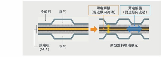 改良膜電極(MEA)材質和隔板的氣體流通性,促進發電必需物質(氫氣、空氣)以及發電過程中產生物質(水、電子)的移動,從而提高了燃料電池組的輸出效率。