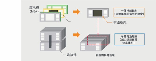膜電極(MEA)的一體式框架可以使燃料電池單元整齊穩定地排成一列。從而縮小了燃料電池組的體積。