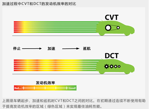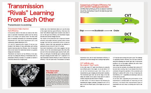 由于傳輸效率和發(fā)動(dòng)機(jī)效率提高,動(dòng)力系統(tǒng)的改進(jìn)會極大地影響車輛行駛里程,從而用任何一種變速器均可提升效率。然而,它們的主要方法卻有所不同。我們要特別關(guān)注DCT和CVT之間的差異。