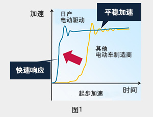 使用獨(dú)立的前后電機(jī),動(dòng)力總成系統(tǒng)可產(chǎn)生高功率和大扭矩輸出。這一輸出輔以日產(chǎn)先進(jìn)的電動(dòng)車技術(shù)提供的1/100-1/10,000*秒超高精度電機(jī)控制,可實(shí)現(xiàn)快速響應(yīng)且超乎尋常的平穩(wěn)加速。(圖1)